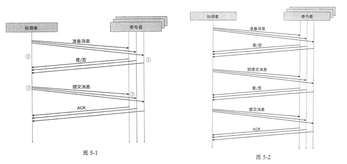 1.参与者在收到准备消息后宕机(图5-1 ①位置),协调者可以加个超时,超时就当作参与者发的否来处理