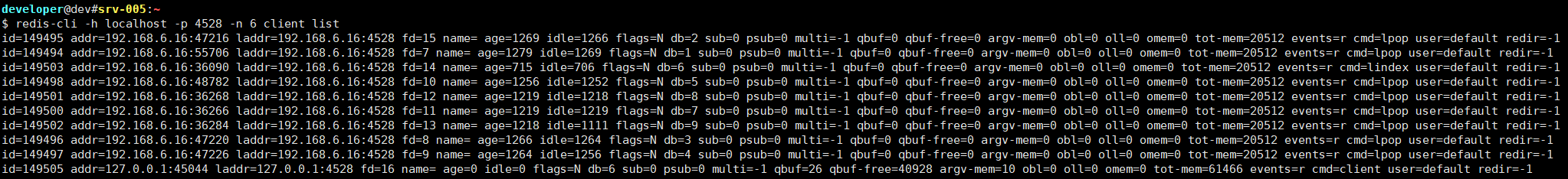 redis-cli -h localhost -p 4528 -n 6 client list