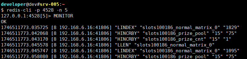 redis-cli -h localhost -p 4528 -n 5 # MONITOR监控的是这个实例执行的所有命令