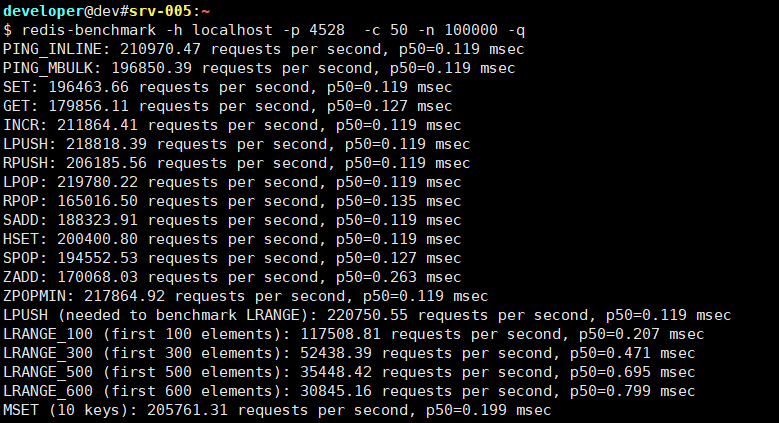 redis-benchmark -h localhost -p 4528 -c 50 -n 100000 -q